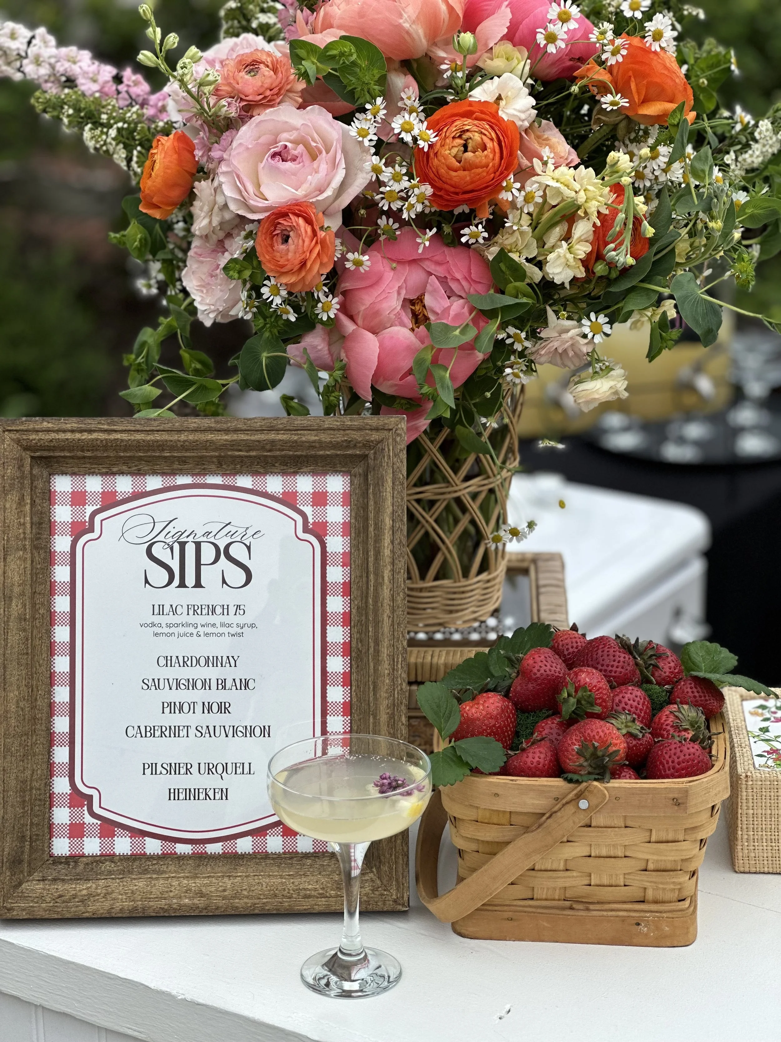 Guests sipped on signature Lilac French 75s and mingled around a cozy outdoor bar setup, nestled near the garden path and surrounded by the scent of blooming lilacs. Strawberries in woven baskets and vintage details rounded out the fresh, farmhouse feel.