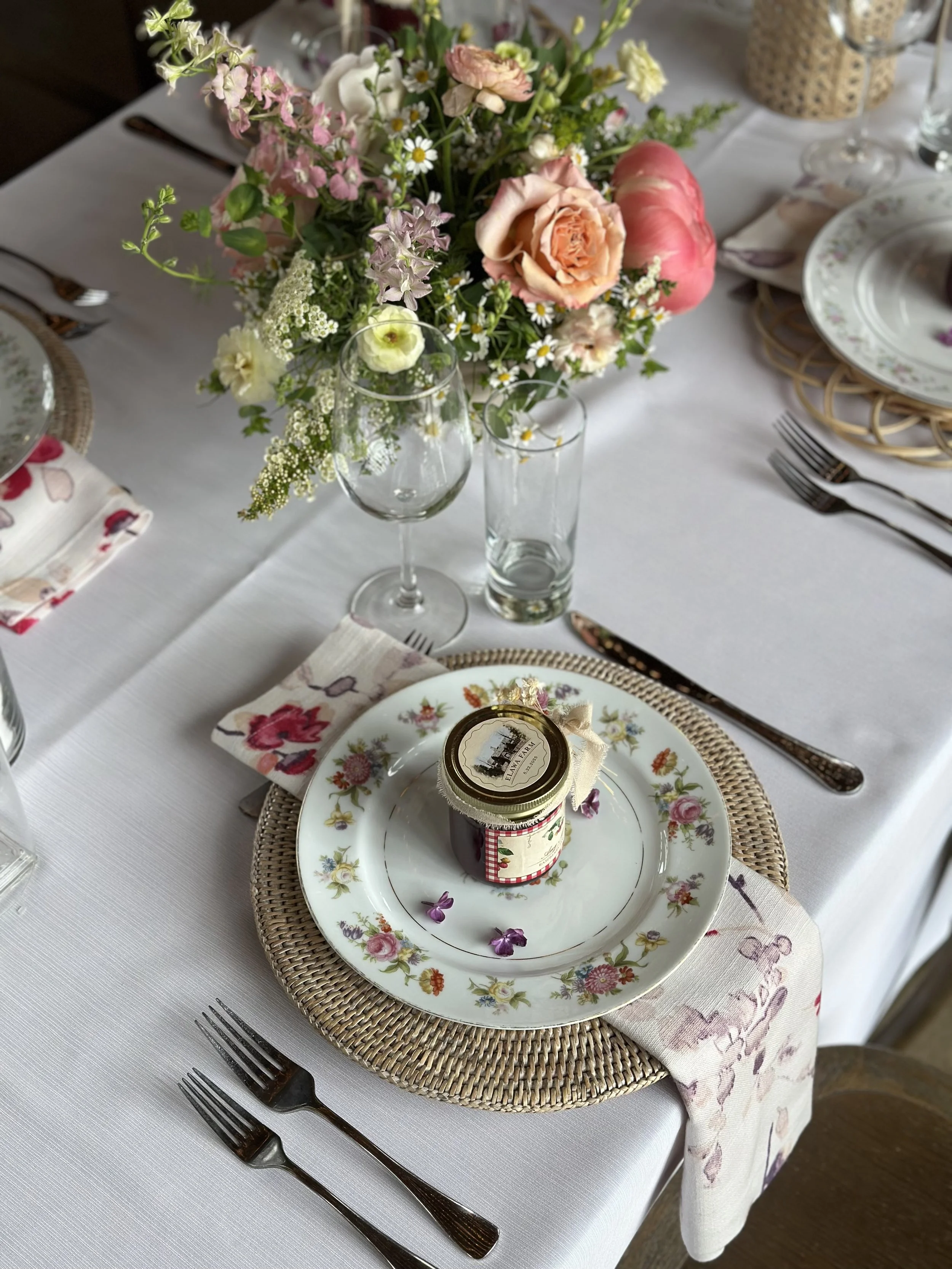 One of our favorite details? The strawberry jam jars at each place setting. These weren’t just sweet favors—they doubled as place cards, each one tied with delicate ribbon and sprigs of dried florals, labeled with guests' names to guide them to their seats. A thoughtful, beautiful touch that was as memorable as it was practical.