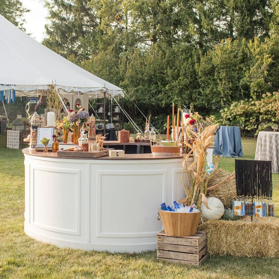 rental for the round bar is $850. delivery and pickup can be added for an additional cost depending on your event location and logistics. our team handles setup and breakdown so everything arrives styled and ready for guests.