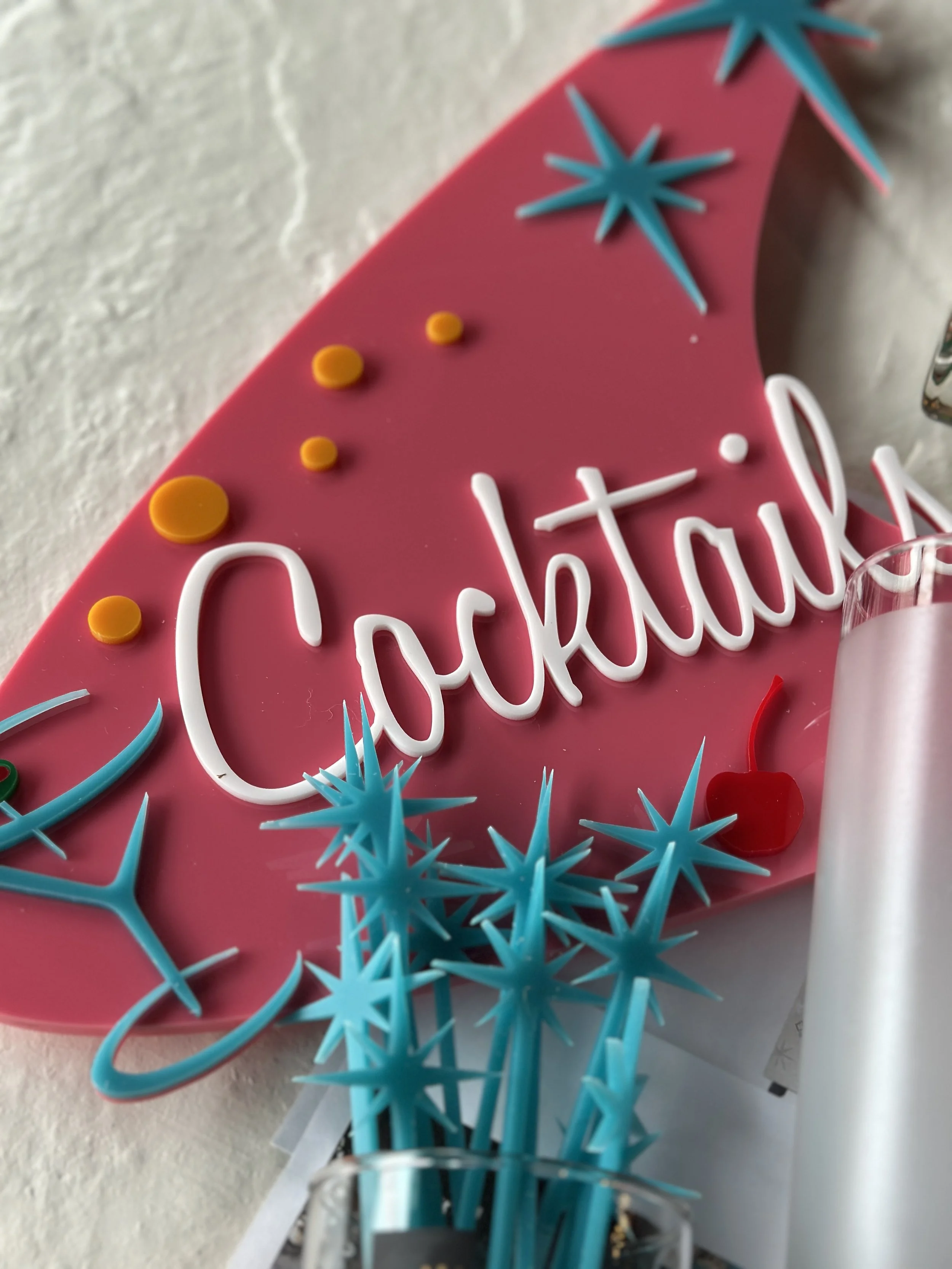 pieces like vintage cocktail glasses, swizzle sticks, barware, and mid century inspired accessories helped tell the story of the design direction. each object may seem small on its own, but together they create a visual snapshot of the event’s personality.