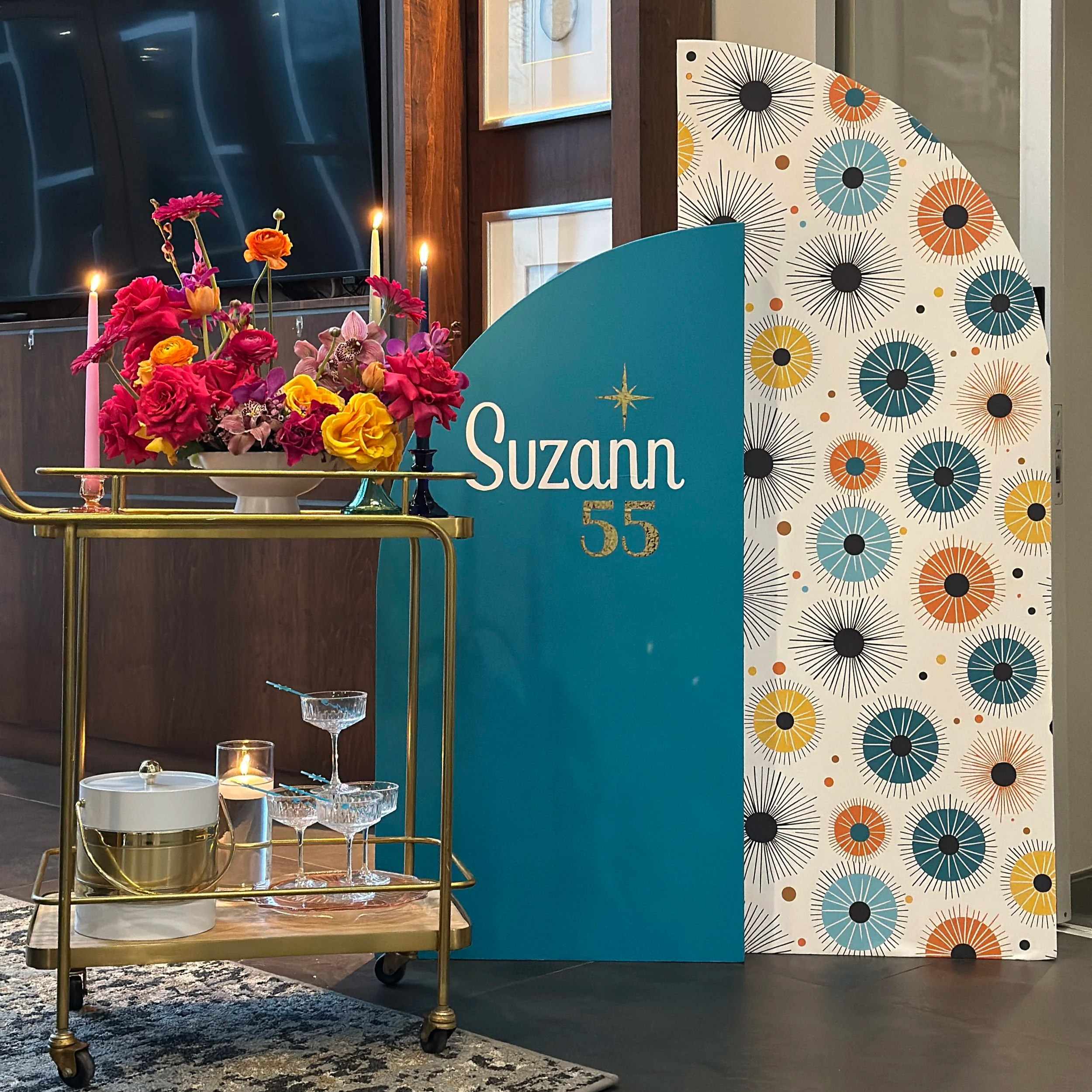 suzann celebrated her 55th birthday surrounded by cocktails, color, and a vintage inspired atmosphere that felt both playful and timeless. the evening was designed to reflect the spirit of mid century entertaining where gathering around beautiful food, thoughtful details, and great company takes center stage.