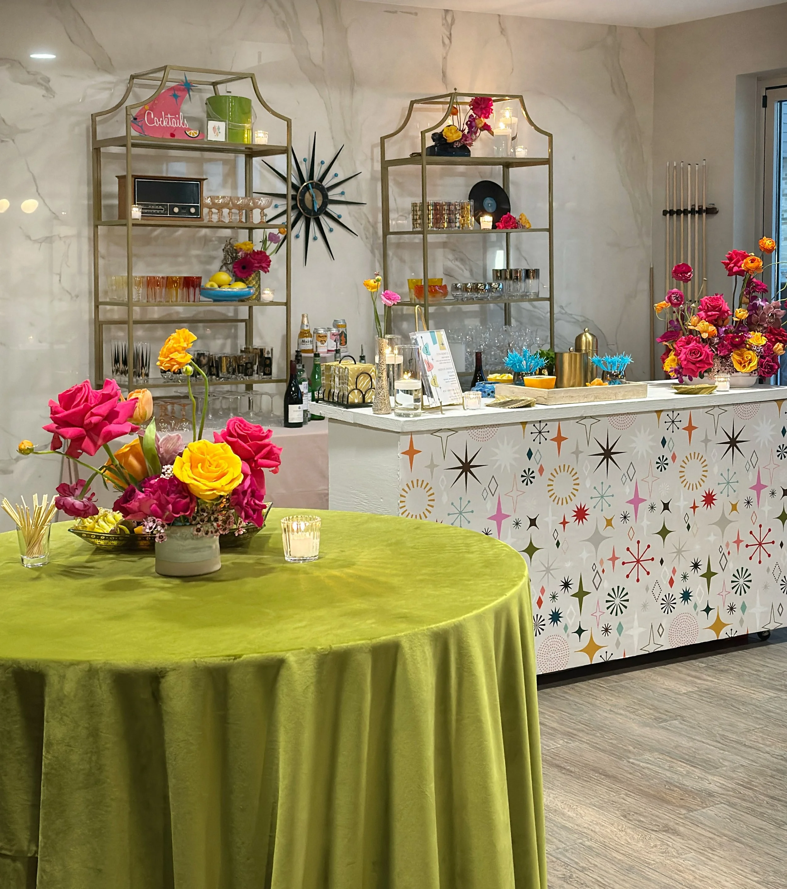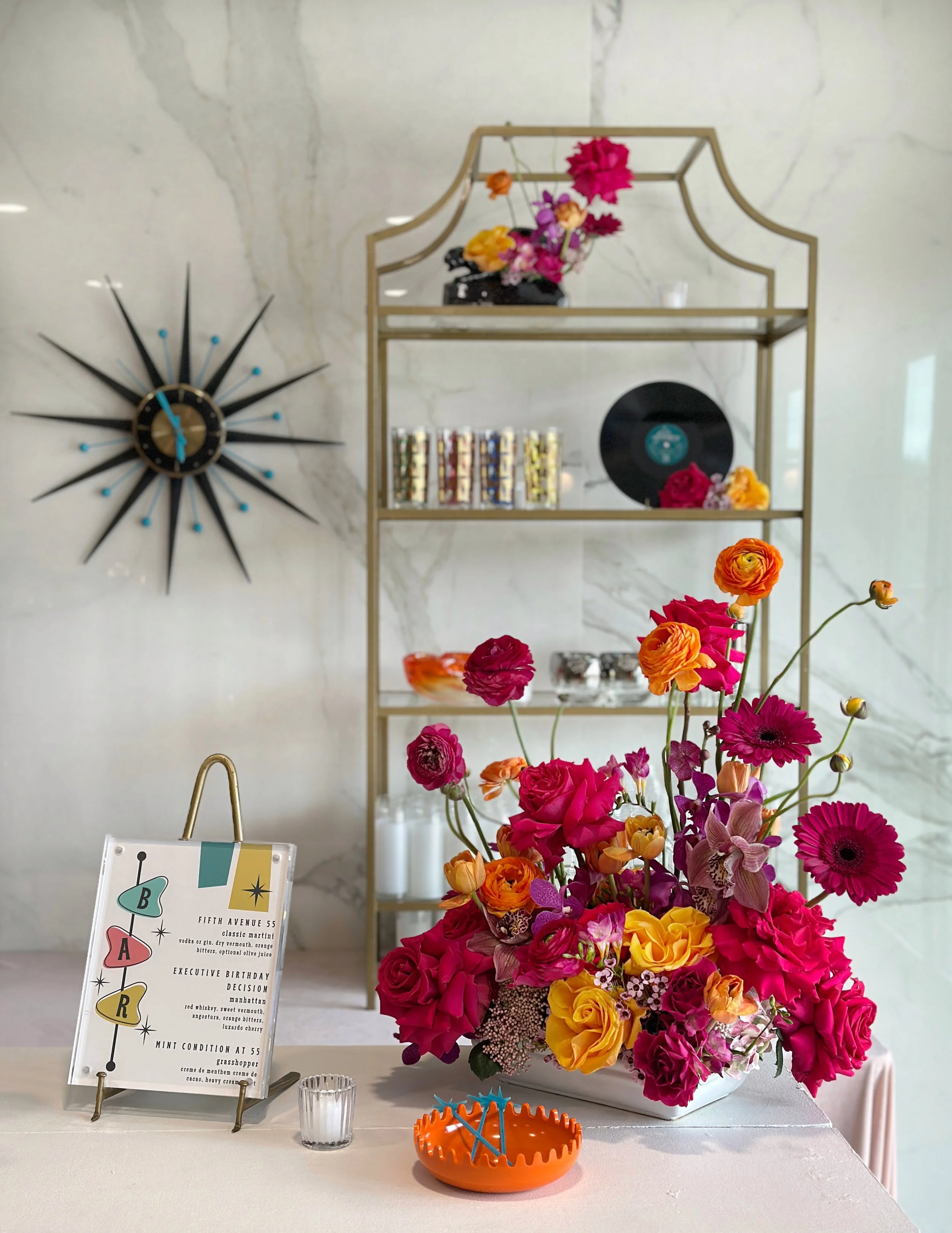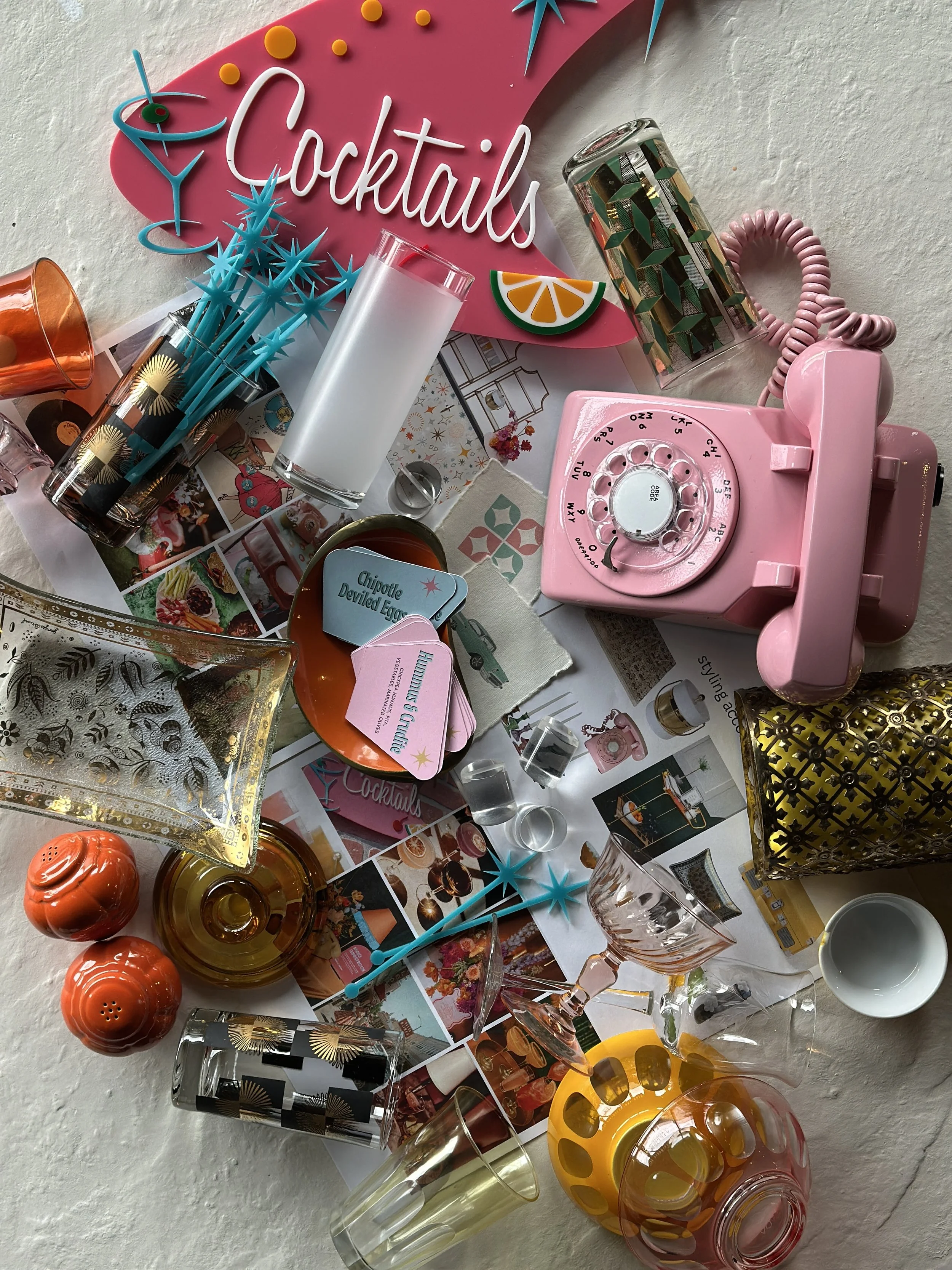 for suzann’s mid century inspired birthday celebration, the flat lay was filled with color, texture, and playful vintage details. glassware, cocktail accessories, paper goods, and styling pieces were layered together to reflect the energy of the evening. bold pinks, warm amber tones, and retro patterns hinted at the vibrant cocktail party that was to come.