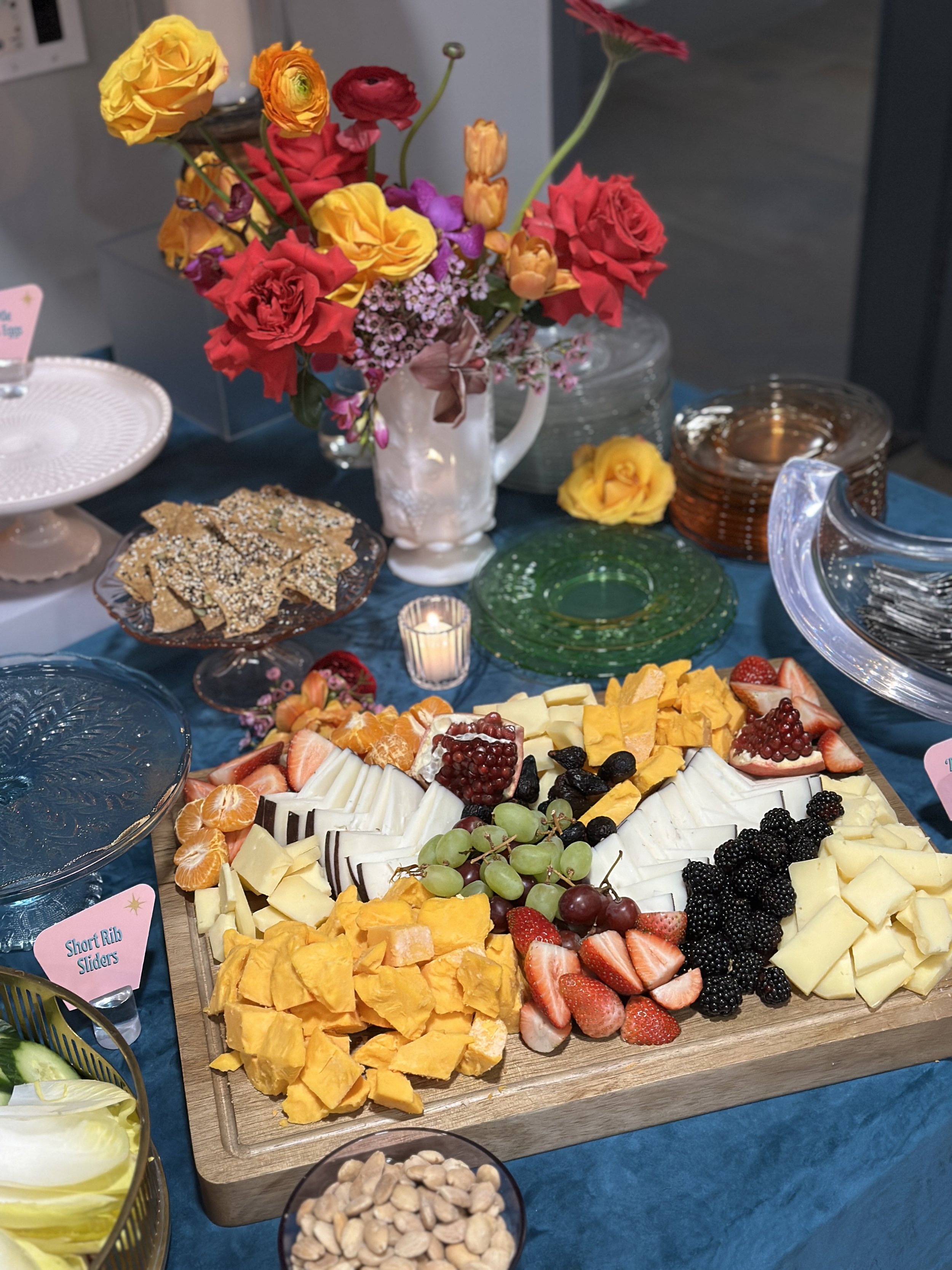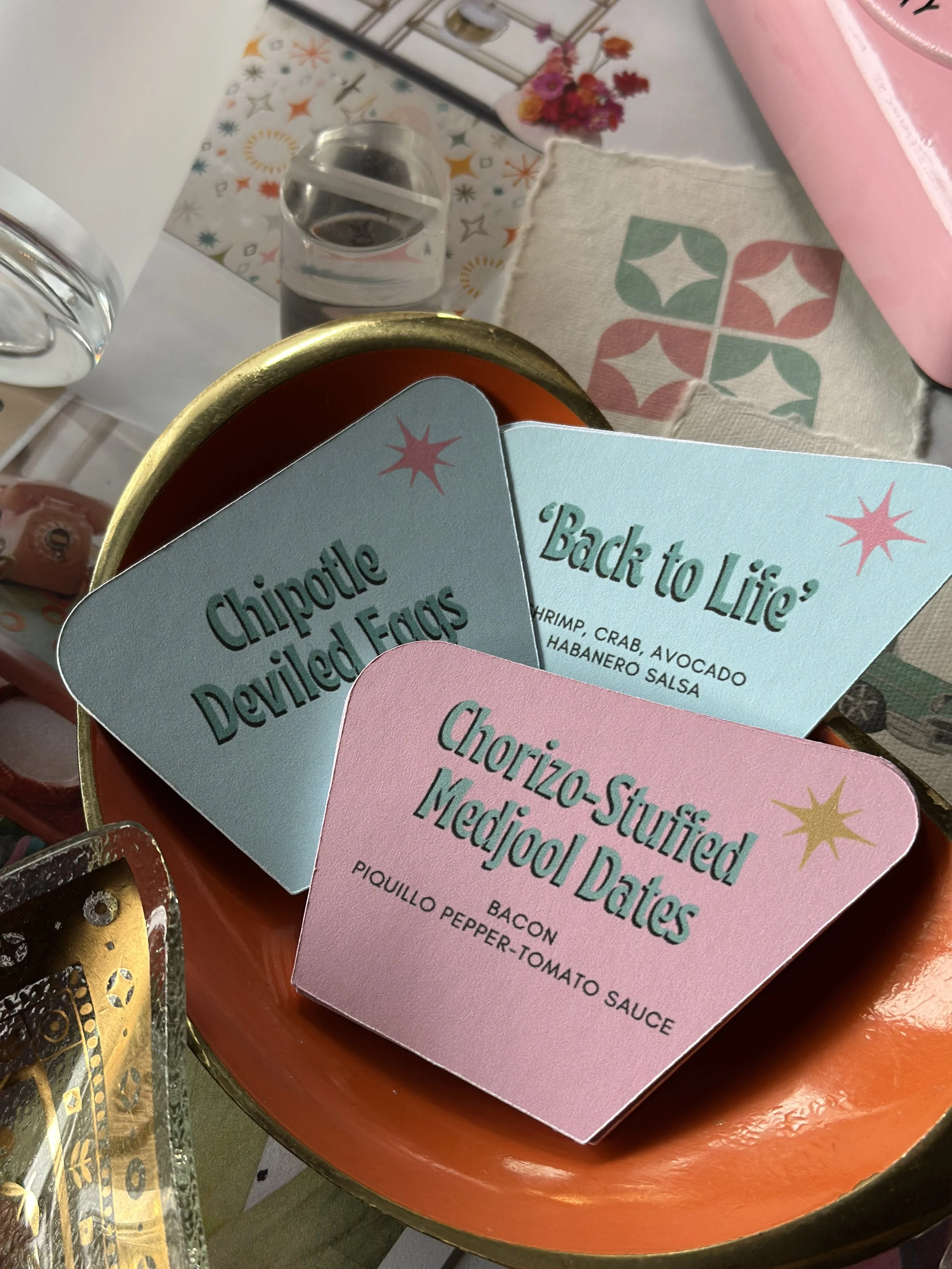 we partnered with one off hospitality to create a menu that felt perfectly aligned with the era. guests were welcomed with classic cocktails including martinis, grasshoppers, and manhattans, setting the tone for a night that leaned fully into mid century charm. the food followed suit with a menu of charcuterie and crudite, deviled eggs, short rib sliders, passed chorizo stuffed dates, and fresh ceviche. traditional relish trays and cocktail style appetizers kept guests mingling and grazing throughout the evening.