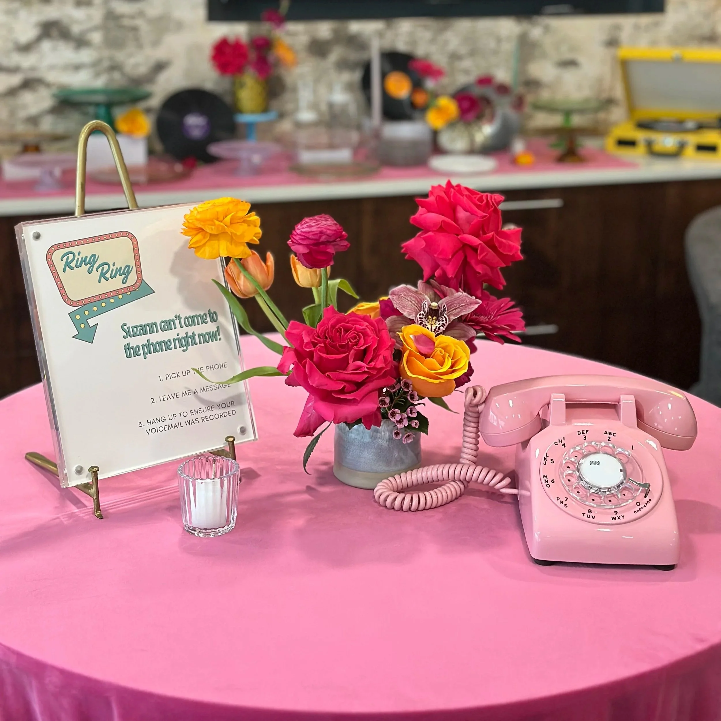 florals by ordinary seed brought beautiful color and movement to the tables, tying together the vintage palette and adding a fresh, celebratory energy to the room. the arrangements balanced the retro inspiration with a modern sensibility, making the entire space feel vibrant and inviting.