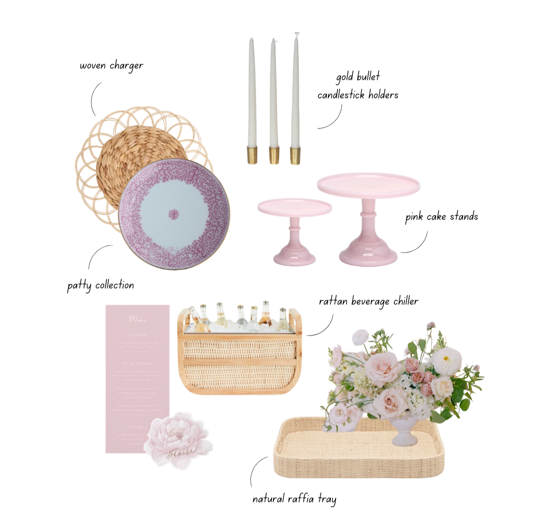 build the base with woven texture and delicate porcelain. layer blush through florals, cake stands, and taper candles for a tonal look that feels cohesive and elevated.