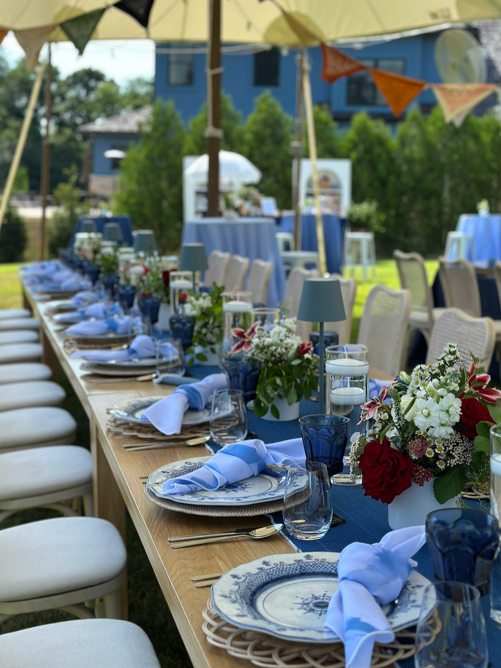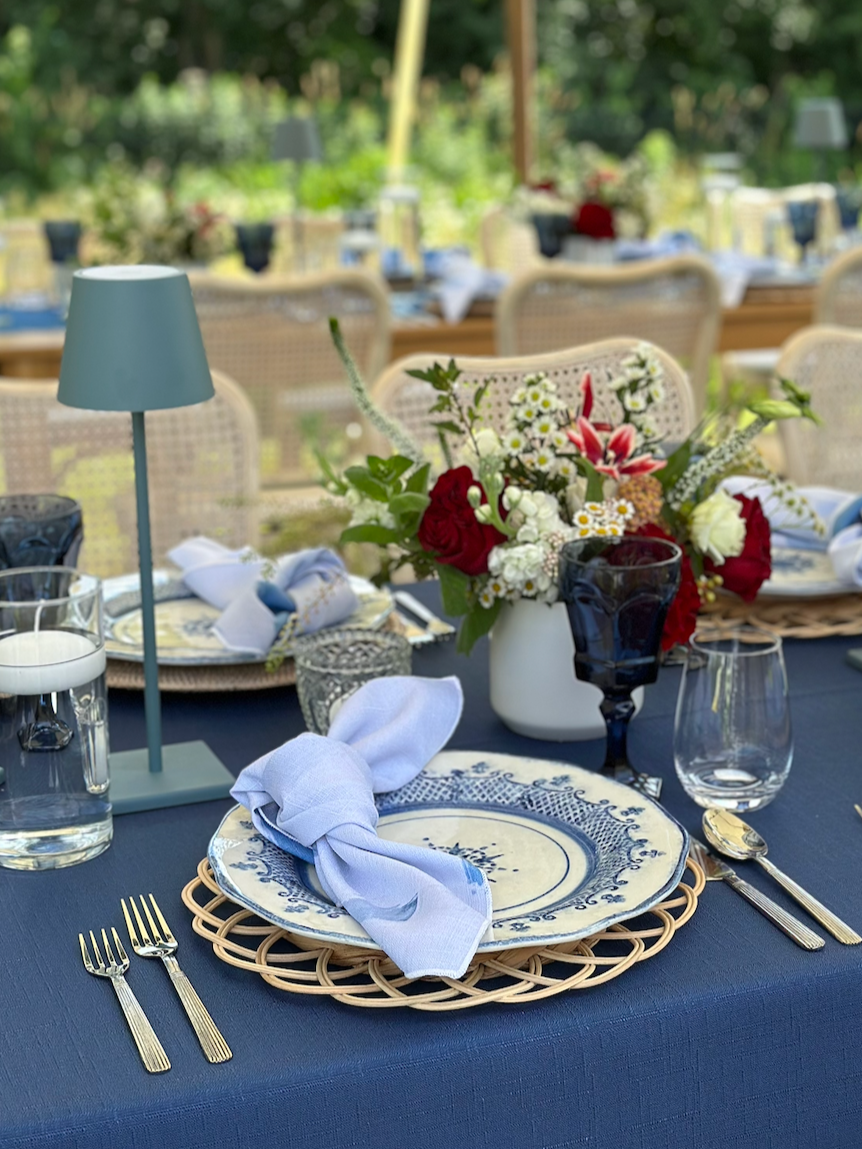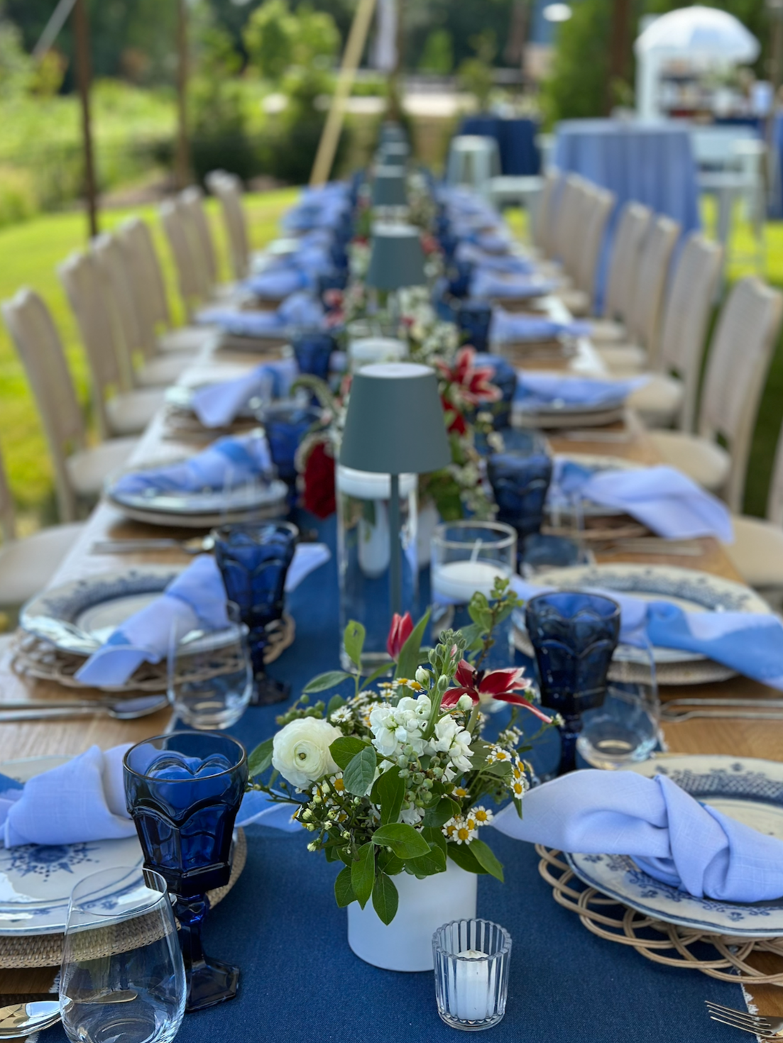 deep and classic, navy goblets bring a timeless, elegant contrast to light linens and bright florals. perfect for sophisticated evening designs.