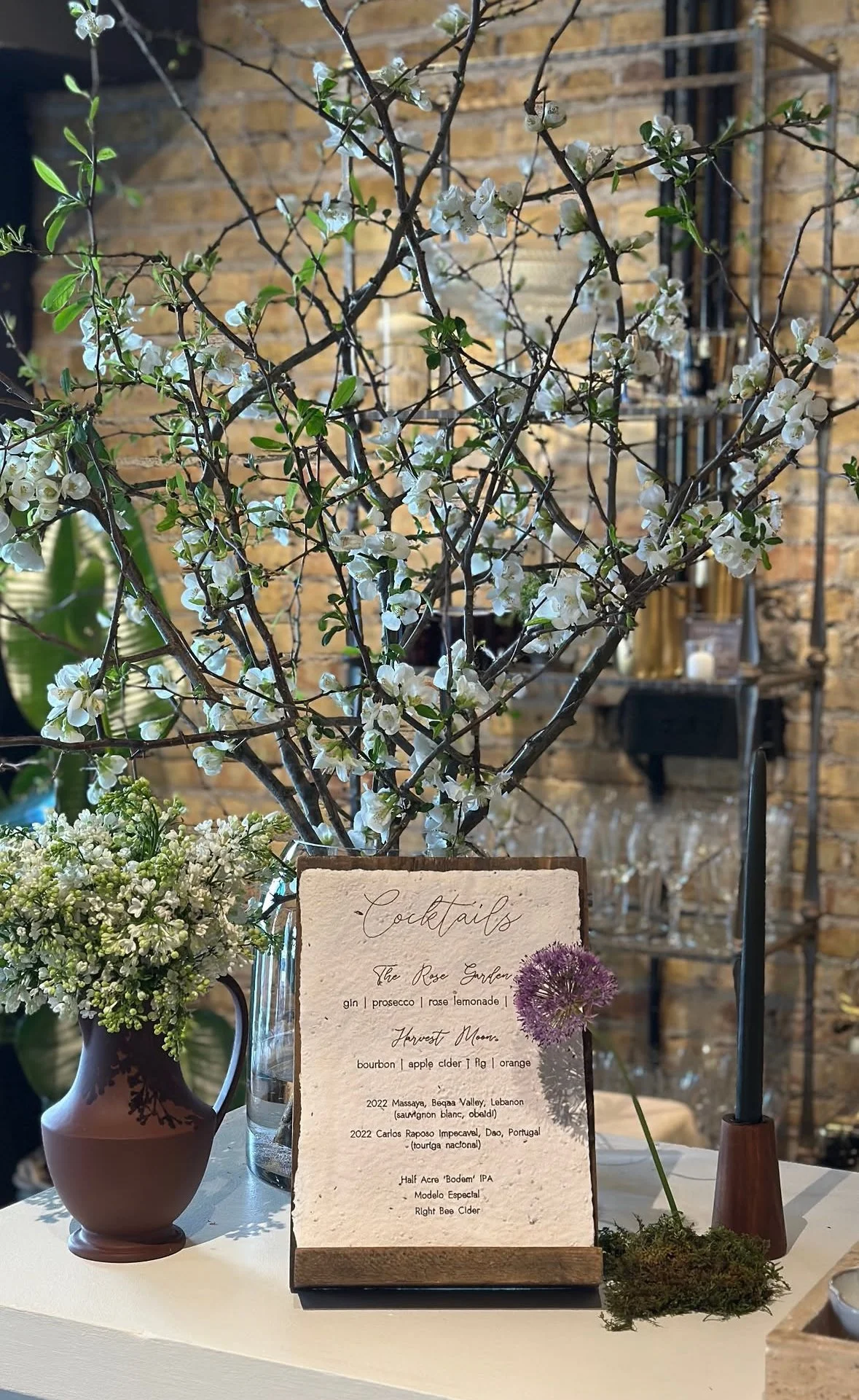 overhead, a canopy of flowering branches by taxaflora created a living installation that evolved throughout the night. guests were invited to write intentions and new beginnings on handmade paper dogwood flowers, adding them to the branches as the evening unfolded. the piece grew fuller, softer, more meaningful with every addition.